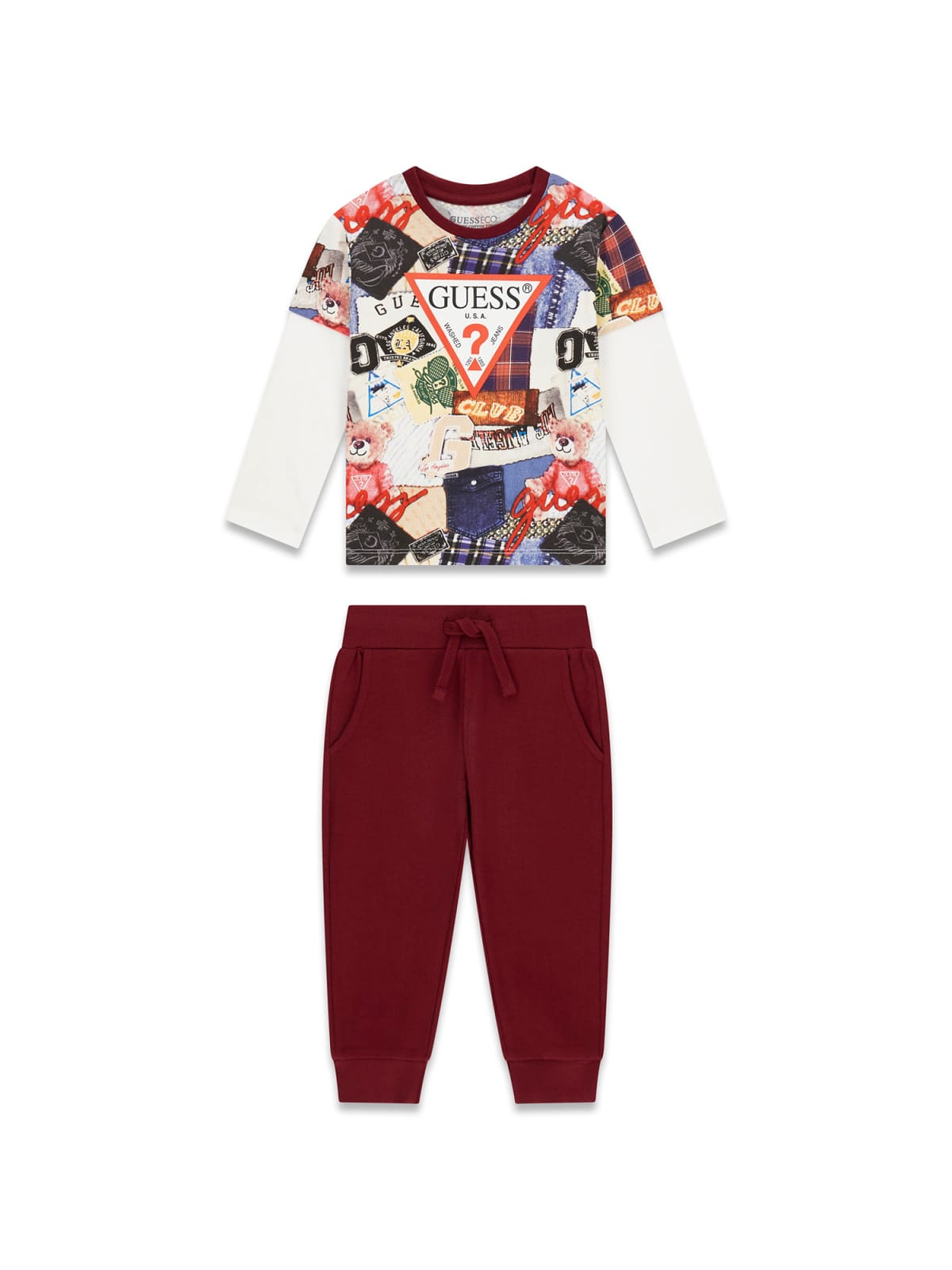 Set da bambino GUESS con t-shirt a maniche lunghe e pantaloni active, in tessuto confortevole con logo, ideale per un look sportivo e casual.