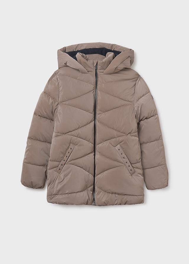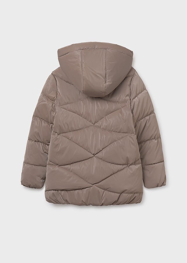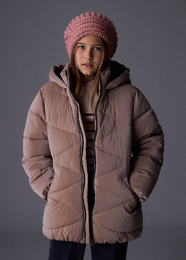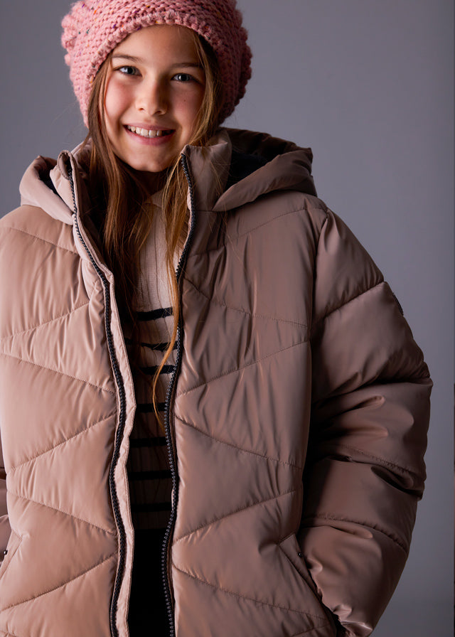 Giaccone in tessuto coated dall'effetto leggermente lucido, resistente al vento e alle leggere piogge. Chiusura frontale con zip, cappuccio fisso e interno foderato per garantire massimo comfort. Ideale per proteggere la tua bimba con stile durante la stagione fredda.---
