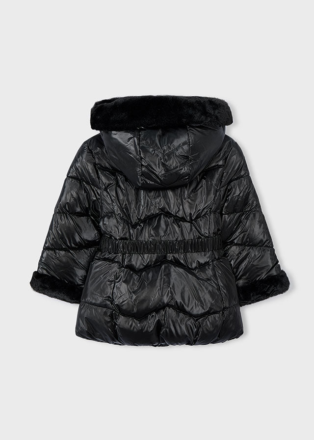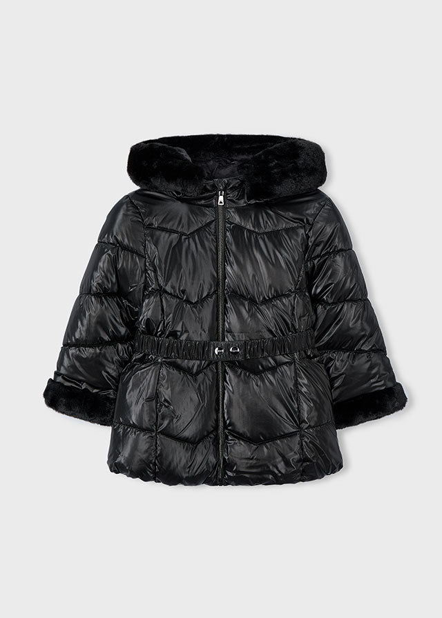 -Giaccone imbottito con finitura metallizzata e cintura in vita. Caldo, luminoso e ideale per l'inverno.
